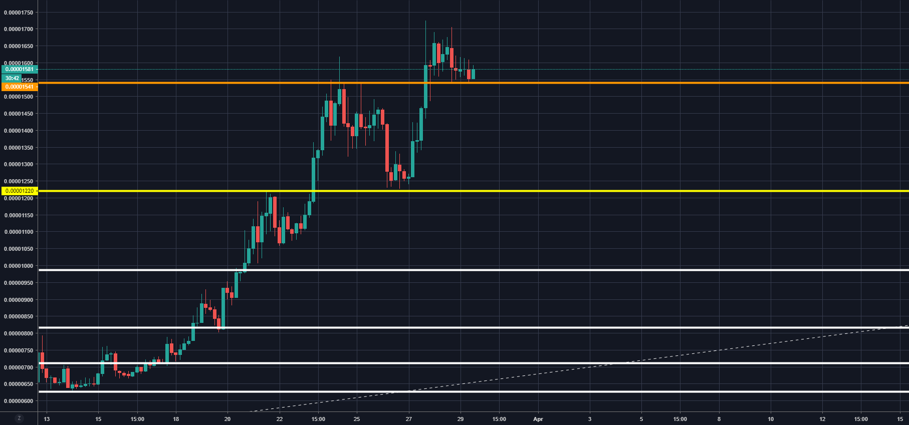RVN/BTC is currently consolidating on top of prior resistance around 1540, and if the trend continues, we should see another leg up. High risk play as RVN is basically parabolic at this point, but FOMO in combination with a 14 month down trending market can be a perfect combination for these coins to continue moving higher as people are excited about crypto again. Use proper risk management and be smart about where you enter and exit. If anyone is feeling generous and would like to support me and my TA, I accept donations! Any donations are greatly appreciated as I am a full-time student in college and it would really help me out! My address is down below the Signature box. 🙂