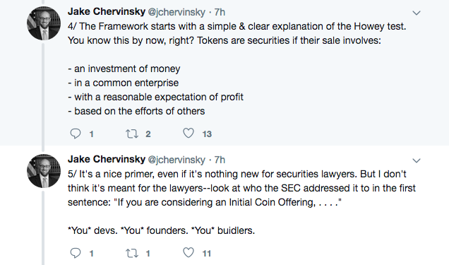 “So, what did the SEC give us today? The Framework is the SEC’s long-awaited “plain English” guidance for ICOs, a solid 13 pages (including many legal citations) explaining how the SEC thinks each prong of the Howey test applies to digital assets.”