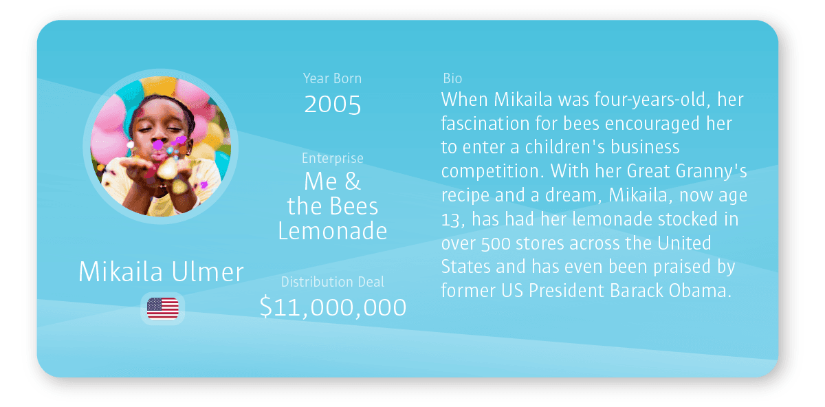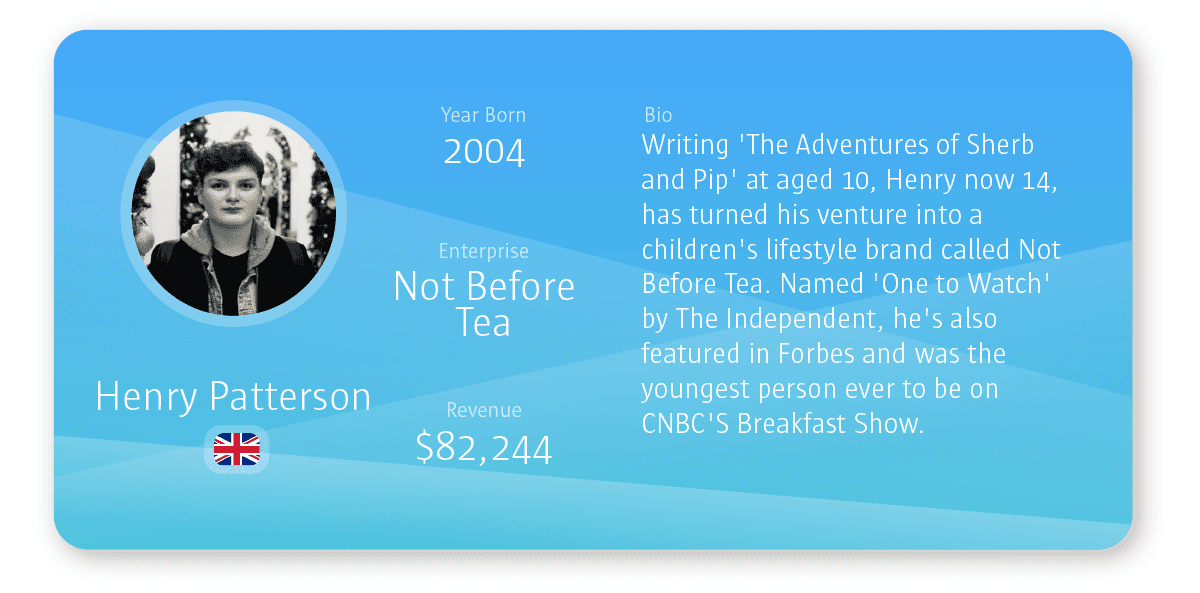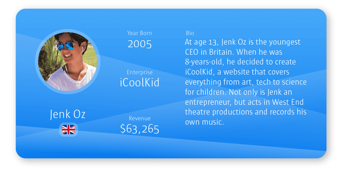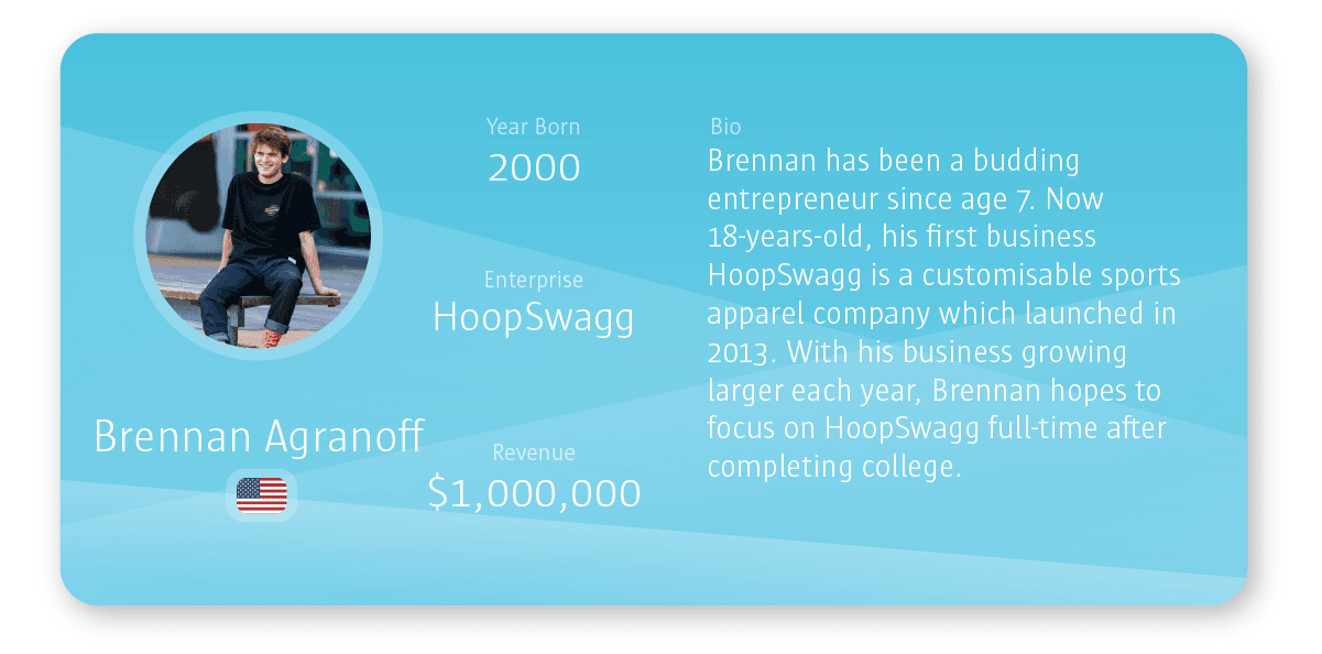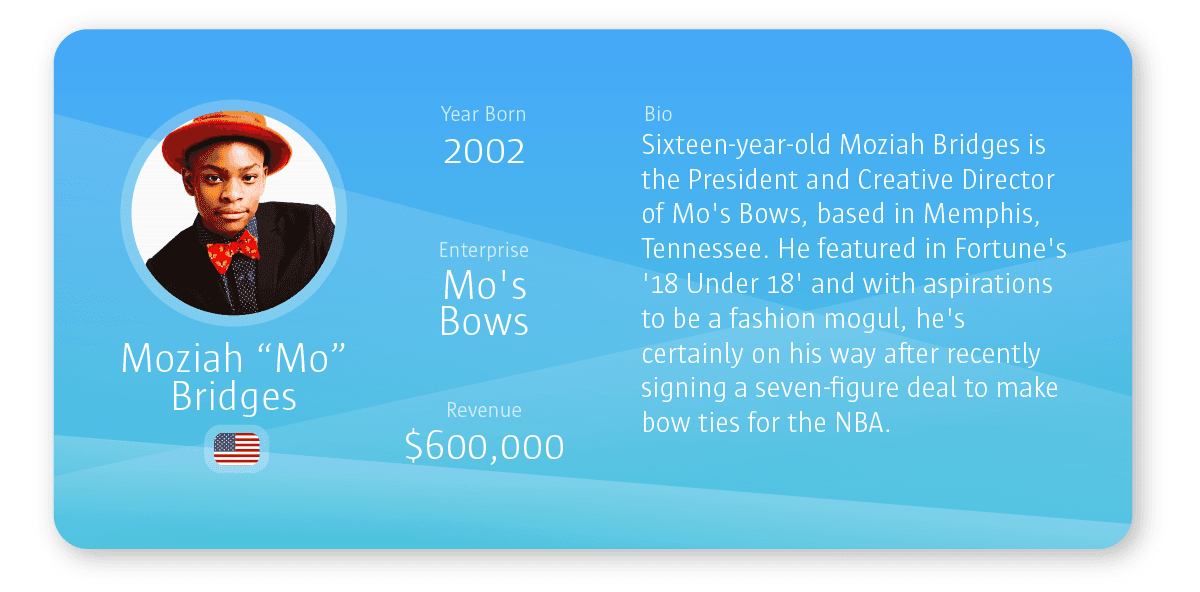 To find out about 11 more of the world’s youngest business creators, please visit the Self-Made Entrepreneurs Born This Millennium graphic .