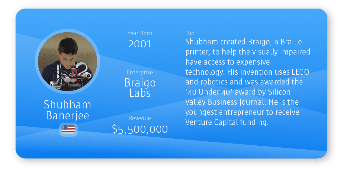 - Braigo – Created by Shubham Banerjee when he was just 12 years old, this company creates Braille printers to help the visually impaired access expensive technology. His invention uses LEGO and robotics to design a product and sell it at less than half the price of others on the market. Banerjee is the youngest entrepreneur to receive funding.