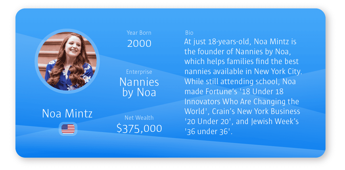 - Nannies by Noa – While growing up in New York, Noa Mintz discovered a gap in the market for an easy way to locate the best nannies available in the area. She used her first-hand experience of being a child in the city and founded Nannies by Noa when she was just 12 years old. This agency provides services including thorough background , workshops for their nannies and ongoing support for their users. Noa now has a net worth of $375,000.