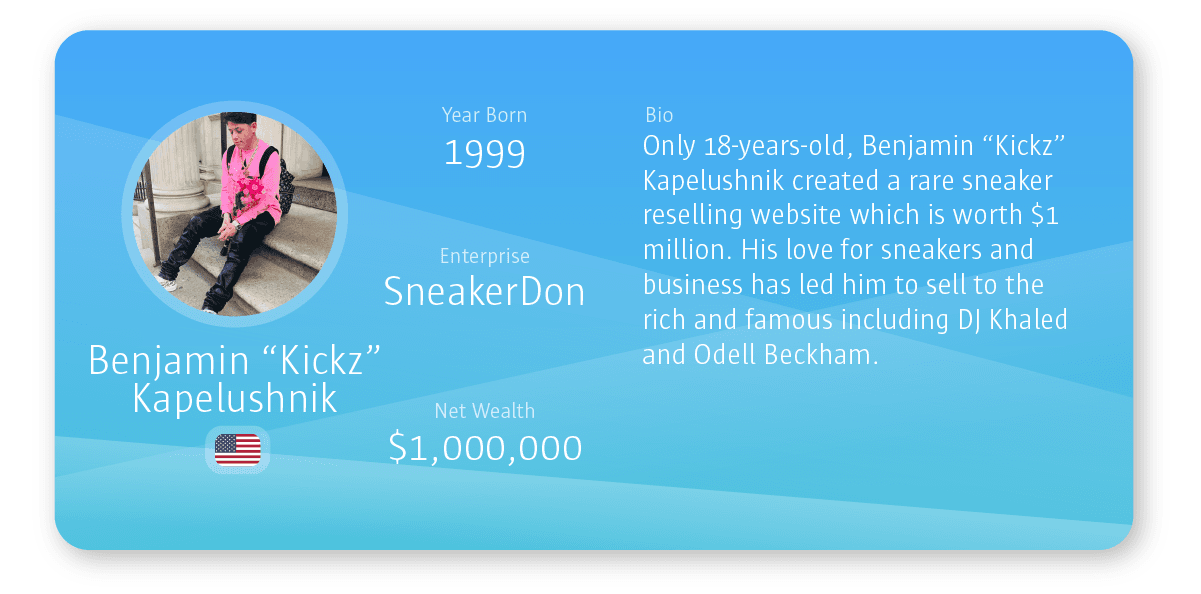 - Sneaker Don – At only 16 years old, American Benjamin “Kickz” Kapelushnik created a rare trainer reselling website as a hobby. As his business grew, he began to gain celebrity clients including DJ Khaled and Odell Beckham alongside an ever-growing customer list. As he made more contacts, he was able to bulk buy sought-after items. His sales are now worth over $1 million.