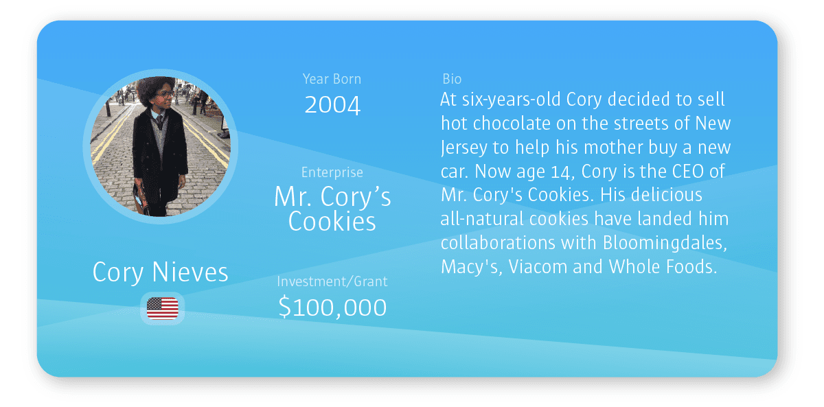 - Mr. Cory’s Cookies – Founded by six-year-old Cory after he sold hot chocolate on the streets of New Jersey to help his mother buy a new car. Now aged 14, Cory is the CEO of Mr. Cory’s Cookies. His delicious all-natural cookies have landed him collaborations with huge department stores including Bloomingdales, Macy’s, Viacom and Whole Foods. Marcus Lemonis invested $100,000 into the company when Cory featured on The Profit in 2017.