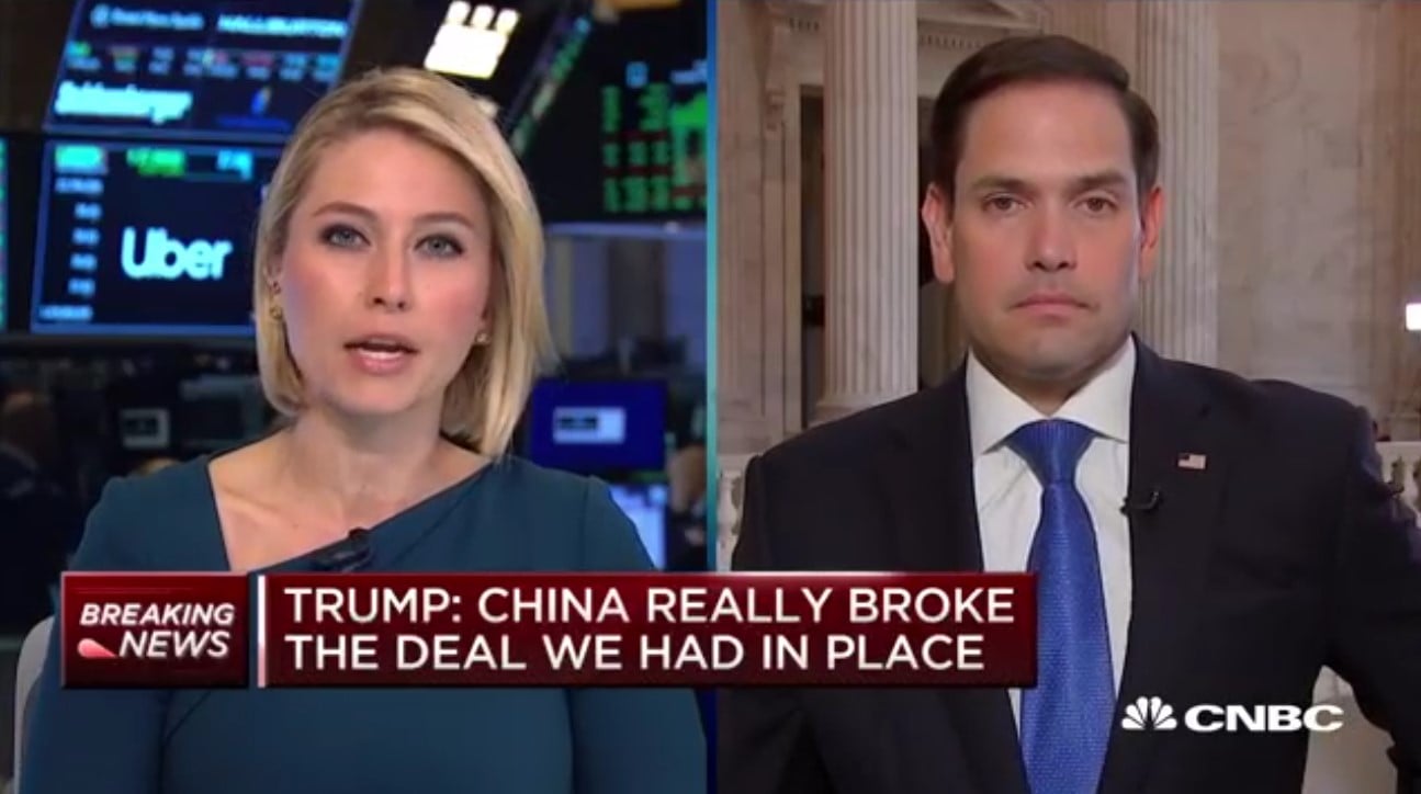 MARCO RUBIO: Well, I don’t think talks have collapsed. Ultimately, I do think both sides will have to talk. But I think he’s doing the right thing. Look, we have no choice but to address this that exists, at large in our relationship, but particularly when it comes to trade. And we have to deal with it now. This only gets harder from here. And, I give the President credit. Look, the easiest thing for him to do in the short-term is leave the status quo in place or cut some fake deal and the stock market will perform well and in the short-term, we’ll have good results from it. But in the long-term, it continues to chip away at the underpinnings of our economy, at the structure of our economy, and will ultimately leave us in a worse place. This existing relationship between China and the U.S., on a number of issues, particularly on trade and on the industry, is out of balance. And If we don’t balance it and balance it soon, the long-term ramifications to the country aren’t going to be harmful, they are going to be catastrophic and they are going to devastating.
