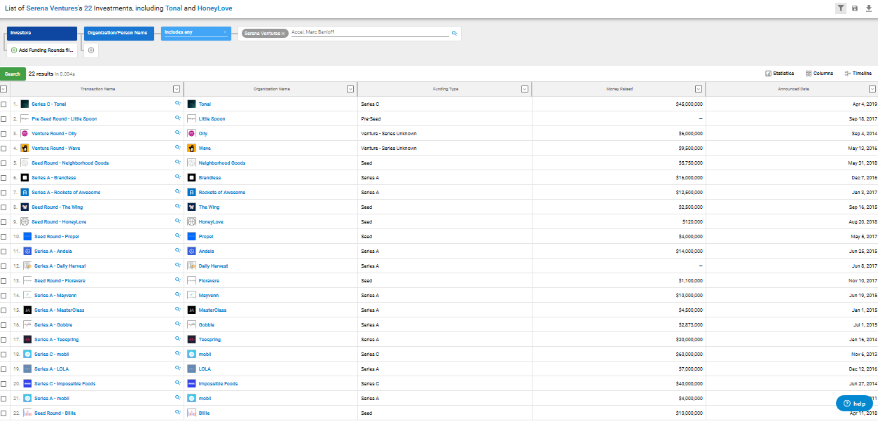 Serena Ventures’ most significant investment is $60 million into Mobli, an Israeli video and photo sharing platform. They have lead one round into a company called Olly, which they have also exited.