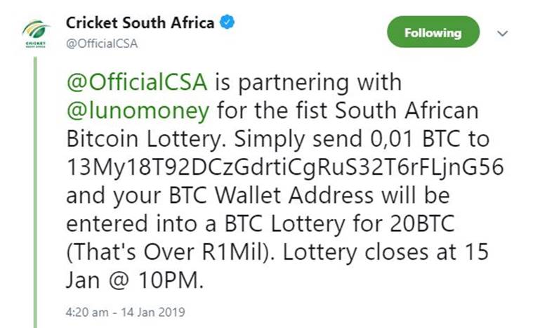 Cricket South Africa (CSA) has been rocked by a Twitter scam, unwittingly offering a fake Crypto [BTC] lottery to its followers,