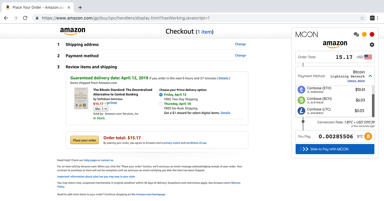 Amazon now accepting bitcoin – the checkout process in action. Source: Moon