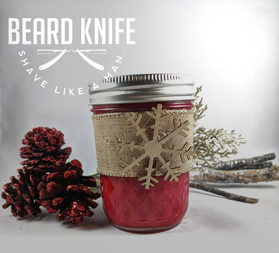 These candles are 8oz glass mason jars and decorated for Christmas.