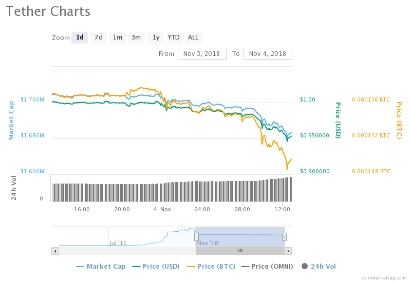 The only thing that can drive the price of any token down, besides generous holders who want to sell at a loss for some reason (which never happens), is sell-offs and decreased demand. While its price has dropped more than 5 cents off the target of $1.00, volume steadily increased over the 24 hour period, indicating the theory is likely correct: traders are liquidating USDT beyond the ability of exchanges to compensate at the desired rate, thus decoupling the bitcoin (and thus dollar) value of the token from its target.