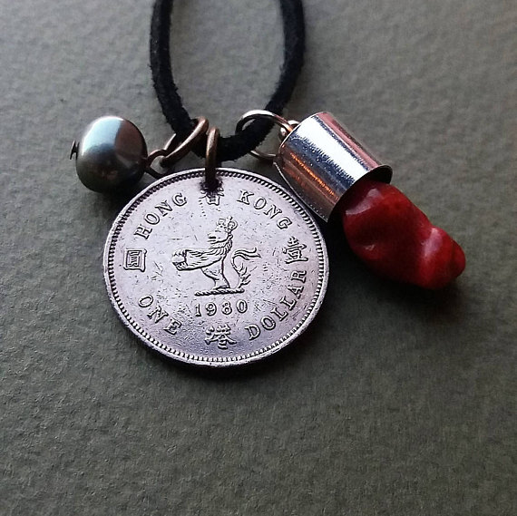 This listing is for a handmade vintage coin necklace made from a 1982 Hong Kong 2 dollars coin. This coin boasts a beautiful iridescent silver shine.