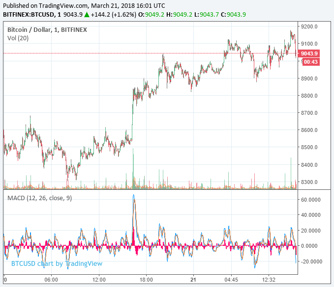 The trailed the index slightly but still managed to plow past $9,000. At present, the flagship cryptocurrency is trading at $9,043 on cryptocurrency exchange Bitfinex, representing a single-day increase of six percent. bitcoin now has a $155.3 billion market cap, as well as a 43.6 percent share of the total market index.