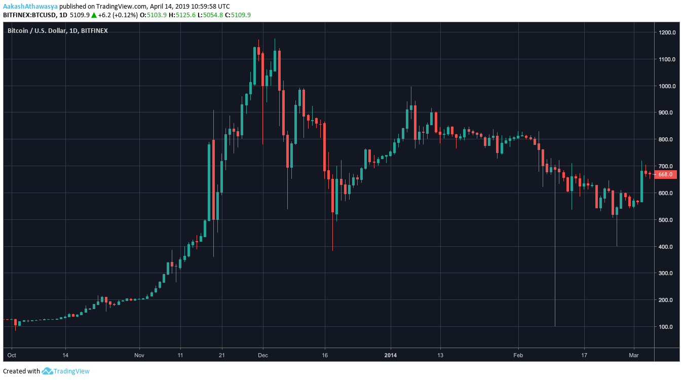 bitcoin, then in its infancy, trading under $250 a month prior to the announcement, saw a massive surge leading into December 2013. A few days prior to the December 8 announcement, the top crypto broke the $1,000 barrier for the first time, touching $1,150 on December 4. Post the announcement, a drop was witnessed to under $700, following which the BTC price managed to sustain at $800 till February but ended up closing 2014 at just above $300.