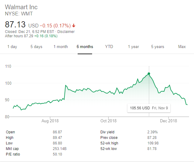 Since November 9, the share price of Walmart has dropped from $105 to $87, by more than 17 percent, a steep loss for the largest retailer in the US market valued at $253 billion.