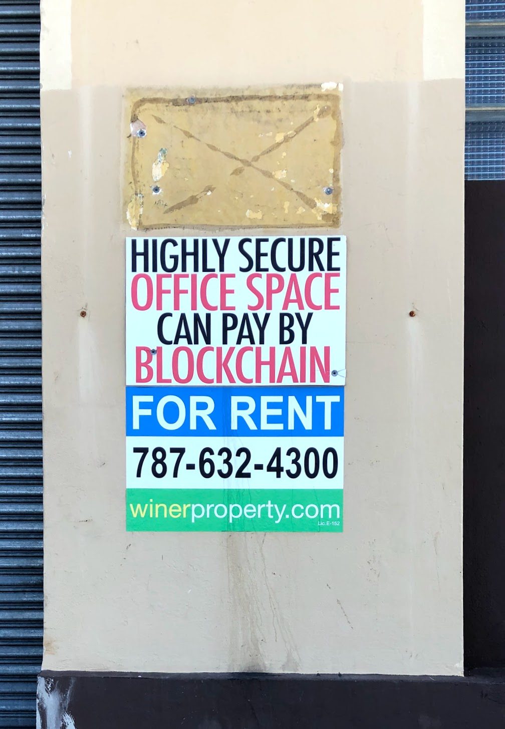 Walking down a busy street in San Juan is a sign, indicating that potential renters of this office building “can pay by blockchain.” Source: CCN/Nicole Grinstead