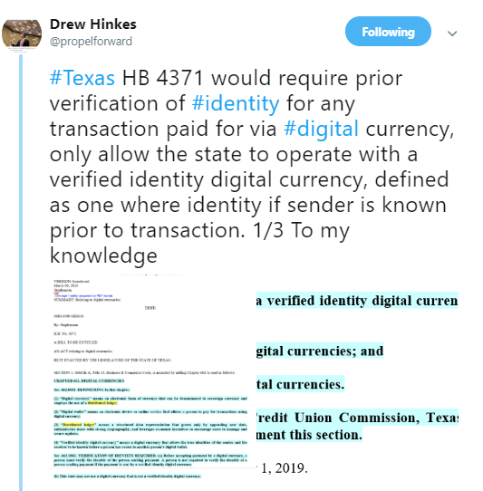 Texans may have to verify their identity to continue using digital assets if the proposed Texas House Bill 4371 legislation is approved. If approved, the bill proposed by Republican Phil Stephenson will come into force on September 1, 2019.