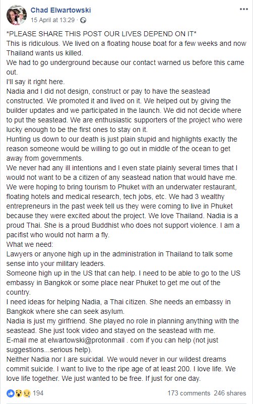 Michigan native Chad Elwartowski and his Thai girlfriend Supranee Thepdet (AKA Nadia Summergirl) have claimed that Thailand wants them killed. Their crime? Living on a seastead (a floating house built on sea) that was put up in international waters.
