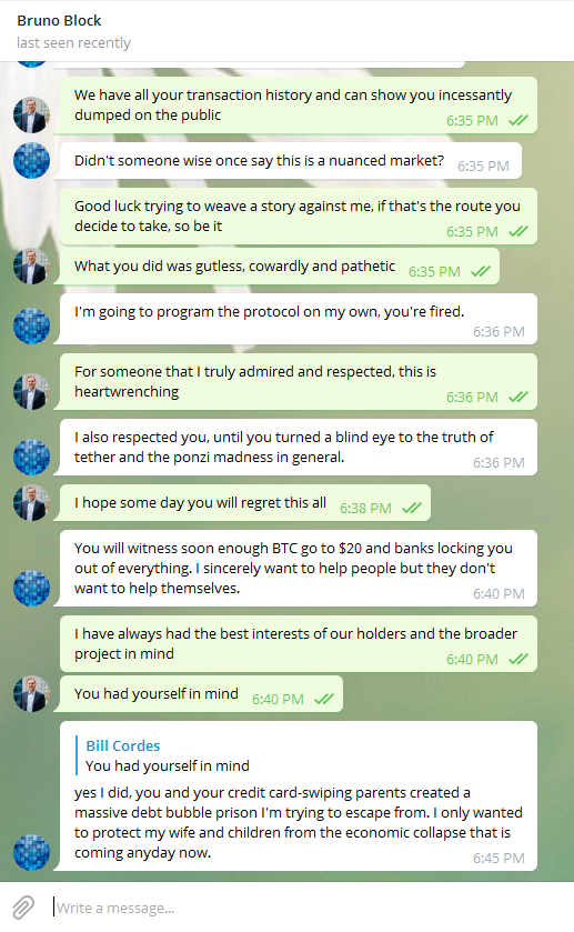 The contains a few screenshots of a Telegram conversation in which Bruno Block never once apologizes for his actions. According to Block, he “dumped on [William Cordes]” instead of allowing Corde and his “VC friends” to “dump on [everyone else.]” In his bizarre justification, he sights as motivating factors the recent price drop of and, in the oddest part, the anti-bitcoin subreddit.