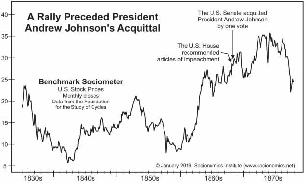 Figure 1 shows the timing of President Andrew Johnson’s impeachment. On March 2, 1868, the House of Representatives formally submitted eleven articles of against Johnson. Yet the Senate acquitted Johnson on May 26, 1868, during a stock market rally that added to the 250% increase since October 1857.