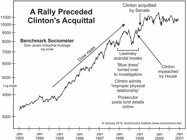 Figure 2 shows that a substantial rally in the Dow preceded President Bill Clinton’s impeachment in the House and subsequent acquittal in the Senate. Some of the most dramatic events in the occurred during the largest slide in the Dow during Clinton’s presidency. And despite a $70-million prosecution of perjury and obstruction of justice charges, the Senate ultimately acquitted the president as the Dow, Dow/gold and Dow/PPI rose to important peaks.