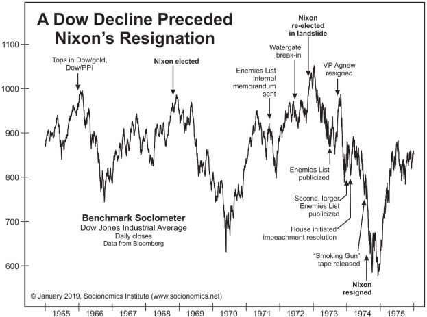 These tendencies show up in the results of U.S. impeachments and near-impeachments, and they’re also evident in presidential re-election outcomes. My colleagues at the Socionomics Institute demonstrated in a 2012 that stock market declines have tended to precede defeats of incumbent U.S. presidents, while stock market advances have tended to precede re-elections of incumbents. In fact, they found that the stock market proved to be a better re-election indicator than inflation, unemployment and GDP growth combined.