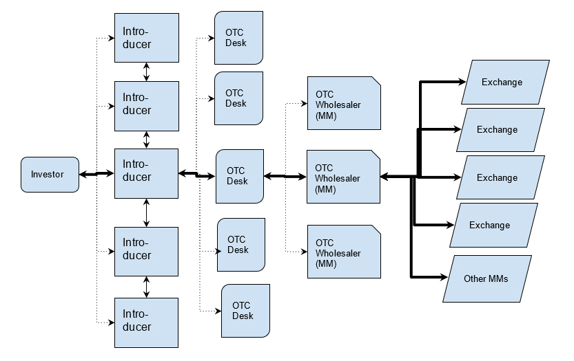In this example, the investor is “represented” by an introducer, who wins from among five introducers that all talk to that investor. The winner contacts five OTC desks to “source liquidity” for its client. One desk is chosen, and it, in turn, contacts three market makers and chooses one for the trade.
