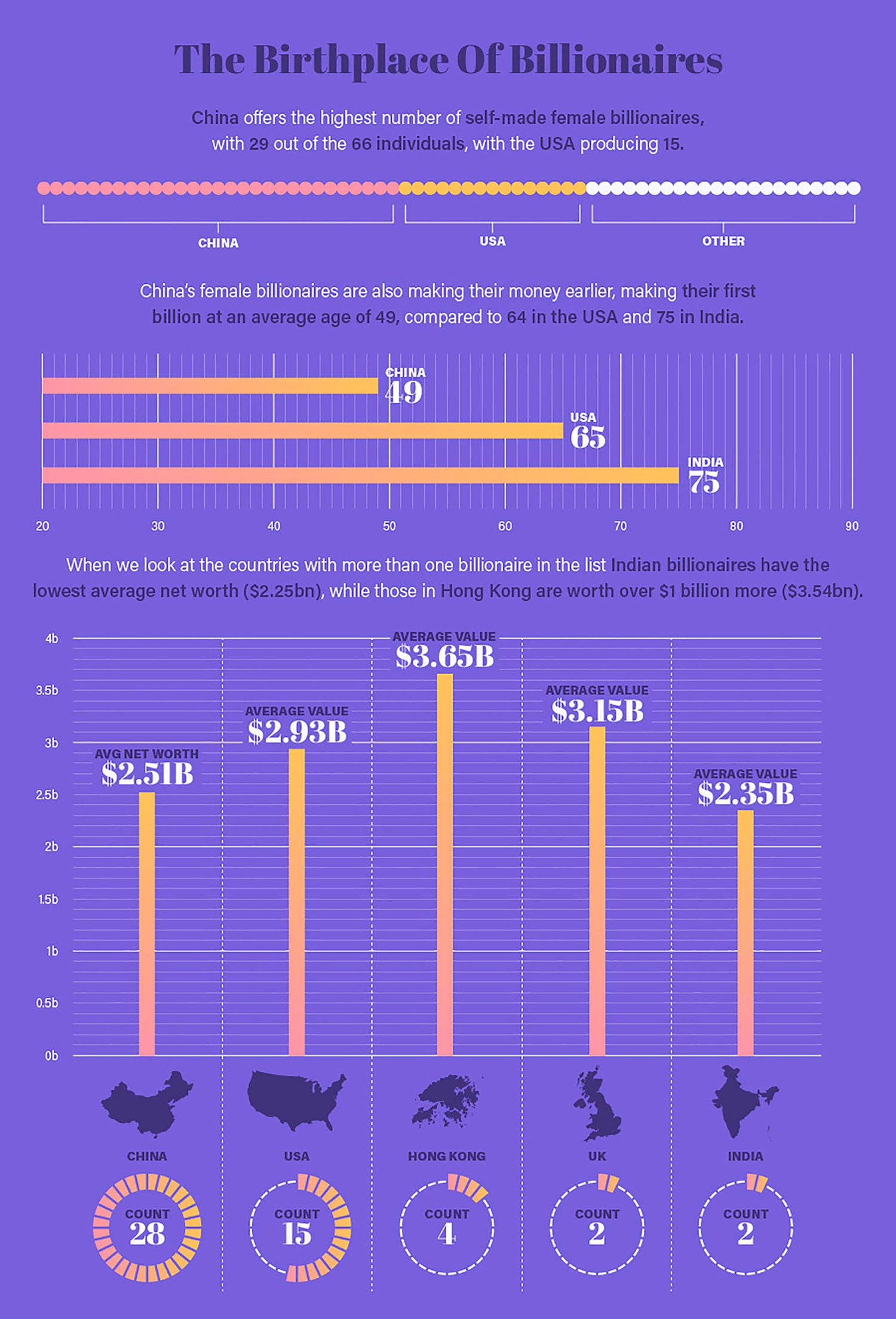 So, what did the world’s wealthiest women have in common? The research found that China and the USA are definitely the places to be for women aspiring to join the four comma club, with the two countries producing exactly two-thirds of the world’s self-made female billionaires (29 from China and 15 from the USA).