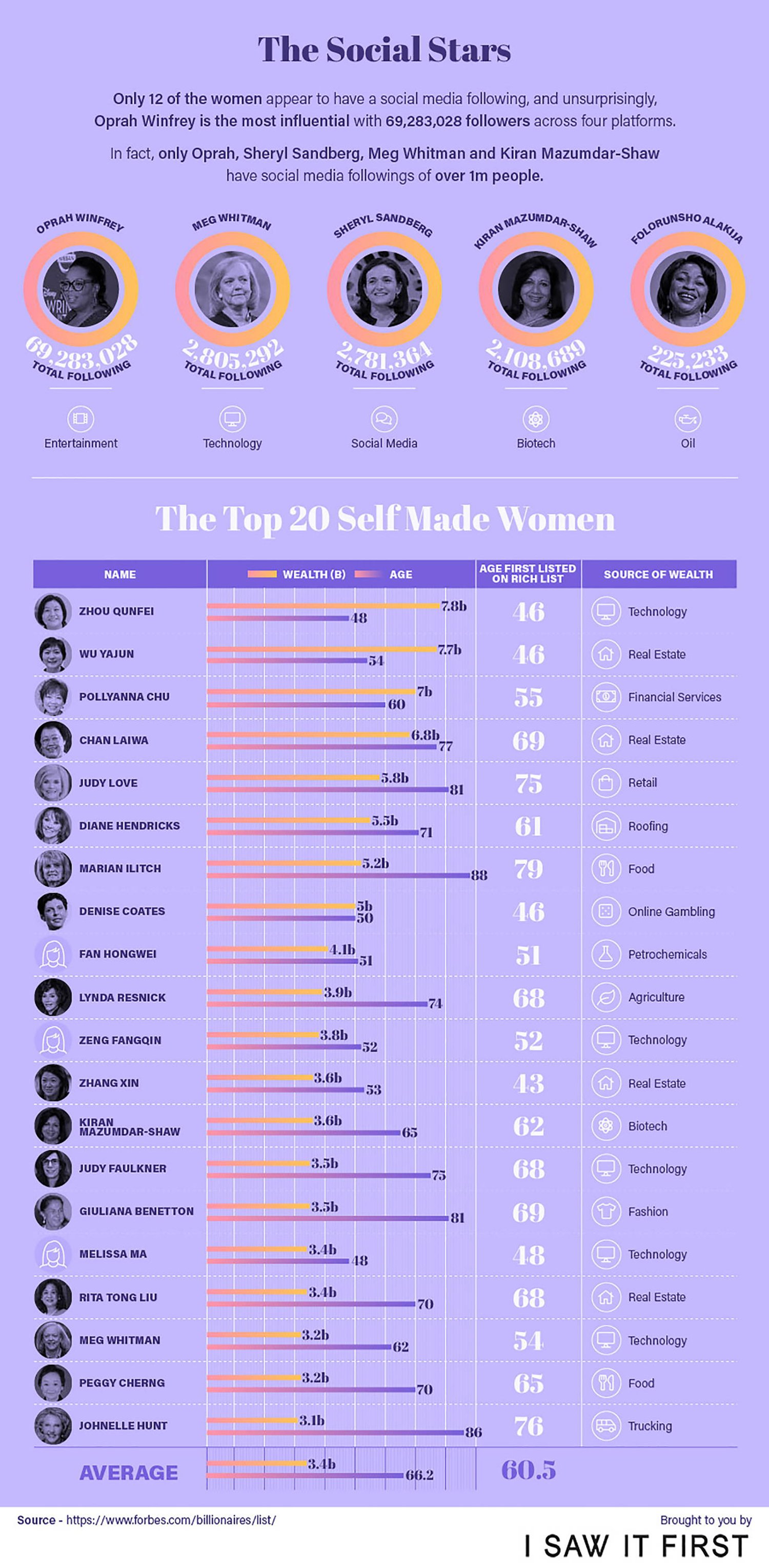Finally, the research looked at the social influence of the self-made female billionaires, which revealed that despite being among the richest people in the world, most prefer to keep a relatively low profile.