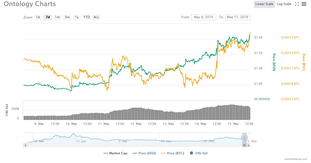 Ontology’s bullish explosion began on May 10, when the cryptocurrency surged from just $0.99 to a high of $1.52 today. Thus, ONT has rallied over 50 percent in less than six days, exceeding bitcoin’s gain of 33 percent for the same period.