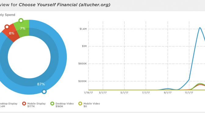 There’s a good reason that you can’t escape these ads. Altucher’s company, the Baltimore-based Choose Yourself Financial, has spent an estimated $2.7 million in advertising over the past 12 months, according to data from .