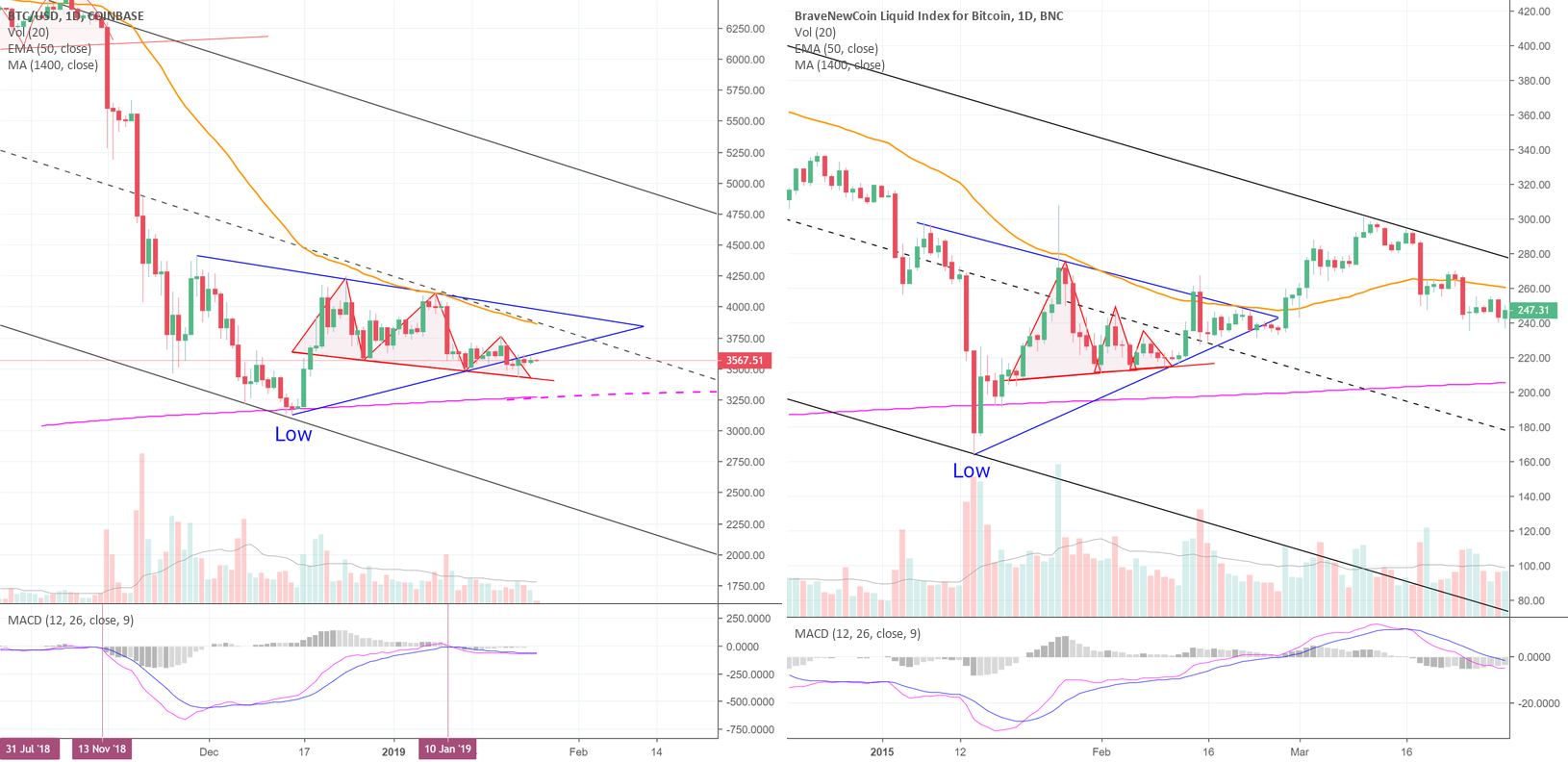Hi friends! Welcome to this update analysis on bitcoin [BTC]! Let’s get right to it! In front of you, I have two of . The chart on the left is the current chart, while the chart on the right depicts bitcoin [BTC]’s progression through early 2015, where the last bear market ended. Today, we’re going to compare the similarities of the price movements, from the final days of the last bear market to today, to try to understand what could be developing in today’s market. Moreover, reviewing the 2015 market action, will give us some insight into the potential dangers if the market deviates strongly from 2015’s general trajectory.