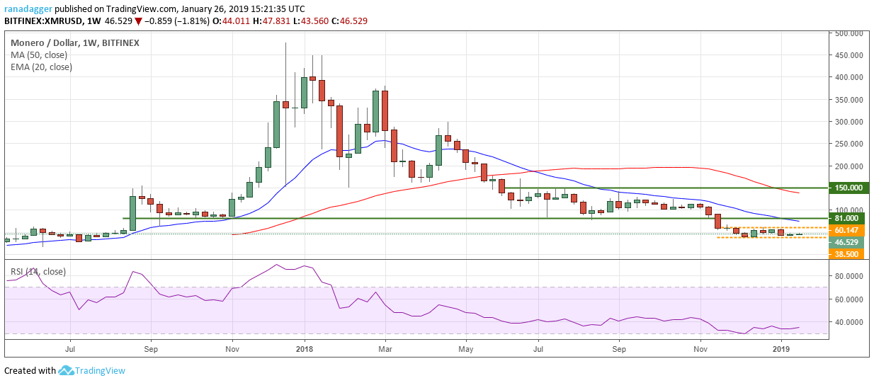 The pair has been consolidating in a tight range of $38.5–$60.147 for the past eight weeks. A breakdown of the range will resume the downtrend and can push it towards the next support at $28.