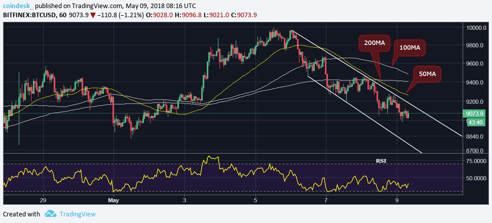 - BTC will likely find acceptance below $9,055 (trendline support in the 4-hour chart) and drop towards $8,652 (April 26 low).