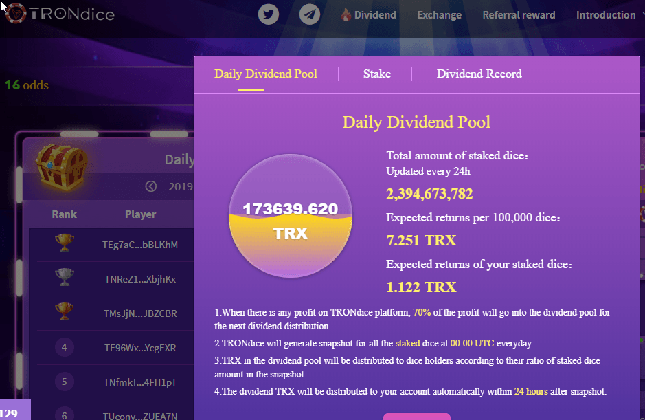 This is what dividends look like on TronDice. To earn a real amount of TRX, you need 10s of thousands of dice tokens. Dividends are paid out at midnight UTC every day.