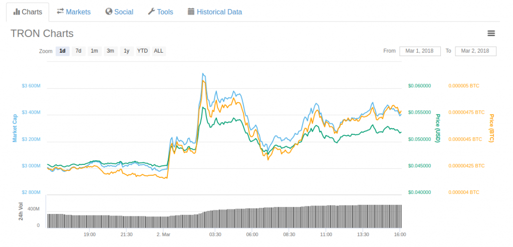 Tron’s TRX tokens were trading for $0.045 yesterday, with the price jumping to $0.056 earlier today. The move places Tron as the fourteenth most valuable cryptocurrency in terms of market cap, with a total valuation surpassing $3.4b and overtaking Ethereum Classic.