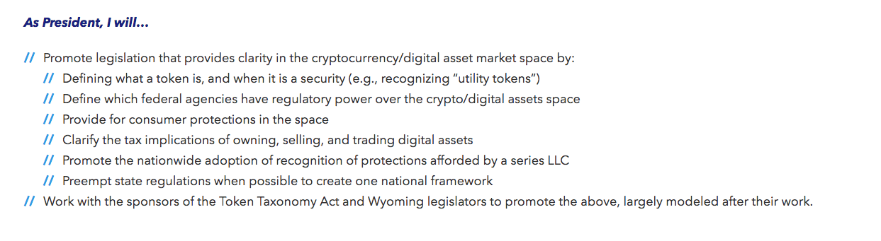 “New Policy #22 – Digital Asset/Cryptocurrency Regulation. Investment in cryptocurrencies and digital assets has far outpaced our regulatory frameworks. Investors need to know what their treatment will be in order to properly innovate in the U.S.”