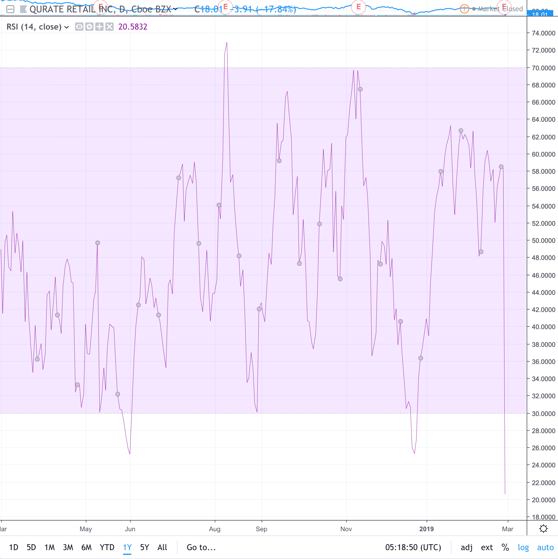 With the last trade executing at $18.01, according to TradingView, Qurate shares are now sitting squarely in oversold territory.