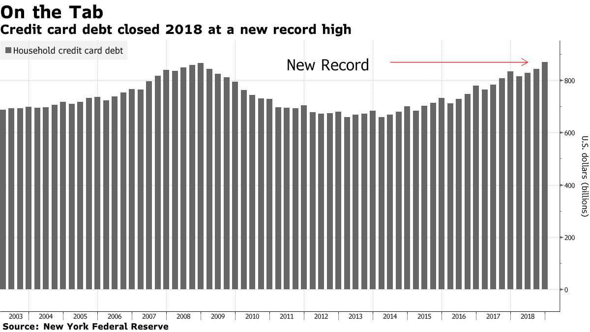 US credit card debt hit a new record, surpassing even the level seen around the 2008 stock market crash. | Source: Bloomberg