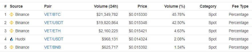The vast majority of the token’s volume continues to coalesce on , the world’s largest cryptocurrency exchange, with the platform’s VET/BTC and VET/USDT pairs accounting for more than 88 percent of all vechain trading.