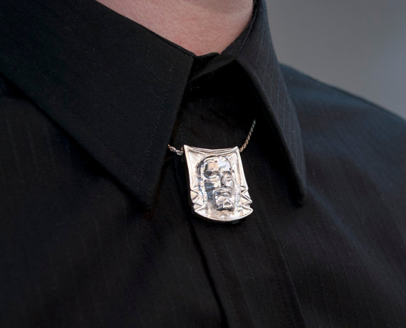 This large pendant features the face of Jesus as seen on the Shroud of Turin. The image of Christ's face was created with the aid of 3d data taken from the shroud itself.
