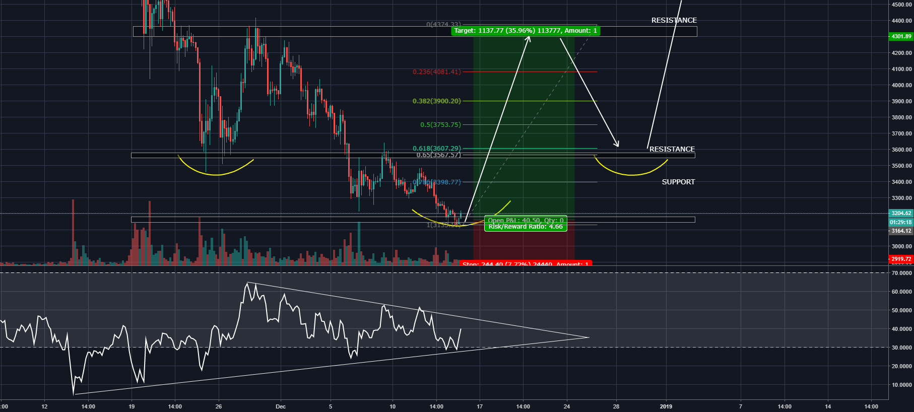 There are multiple different ways to trade this pattern. You can take a more aggressive high reward play, and long support from $3,120-$3,190 with take profit set at the neckline.