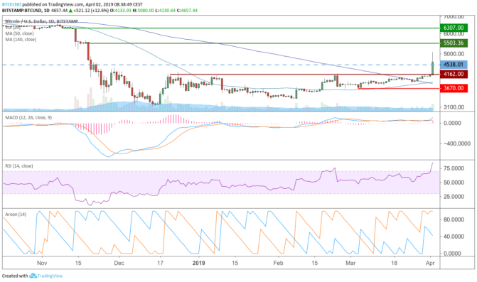 „Mit einem beherzten Pump konnte der über die seit Ende letzten Jahres bestehende Resistance steigen und testet aktuell den durch das Plateau von Ende November definierten Widerstand. Ein Blick auf die Indikatoren mahnt ein wenig zur Vorsicht: Zwar ist der MACD positiv und steigend, das Aroon-Up-Signal ebenso hoch, jedoch ist der RSI stark überkauft. Zwar sollte man nicht zu viel auf einen RSI über 70 geben, jedoch kann es, wie man Ende Februar sah, zu einer Kurskorrektur kommen, die auf den Support bei 4.162 US-Dollar zurückfallen könnte. Insgesamt bleibt die Einschätzung dennoch eher bullish. Sollte der Kurs weiter steigen wäre die nächste große Resistance bei 5.503,36 US-Dollar, bevor die große Seitwärtsphase von September bis November 2018 getestet wird.“