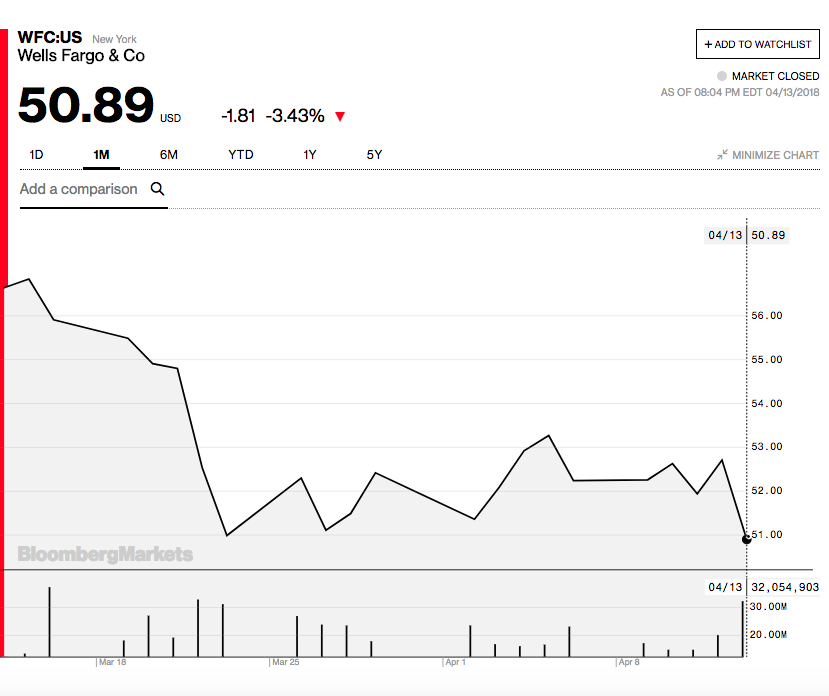 also experienced a first quarter increase in profits of 5 percent to $5.9 billion, adding the caveat that the numbers could be recalculated after a potential $1 bln regulatory settlement, notes. Wells Fargo share price was around by market’s close yesterday, down more than 3 percent.