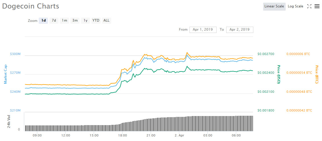 After a month flat-lining DOGE lifted off yesterday in one huge spike that propelled its price to a new 2019 high of $0.00253 (60 satoshis). The 20% pump caused daily volume to surge from $20 million to $50 million with most of it on Gate.io and ZB.com. It is the biggest single move for Dogecoin since mid-December but was it a coincidence coming on April first?