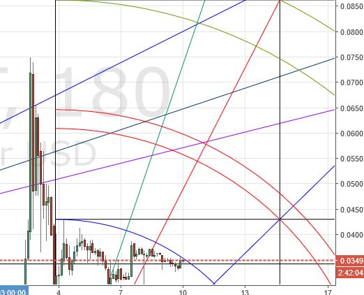 As you can see, the coin’s price has been showing a fair amount of respect for the setup shown above for some time. It should therefore come as an item of interest that price has just closed above the 1st arc of the 3rd arc pair. It wasn’t a “convincing” close. In other words, it is close enough to the arc to be called “at resistance”.