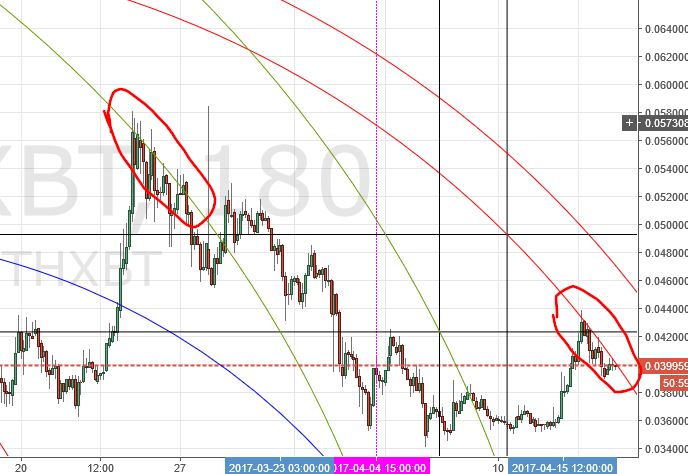 Let’s look at the ETHXBT chart as an example. I have removed many of the lines, Gann Fans in particular to make this screenshot easier to understand. If you look, you will note that there are not one, but two different setups on the same chart. Price encountered a 2nd arc pair (green) which brought the price down over a few weeks. It rose again until it hit a 1st arc pair (red) of a shorter-term setup.