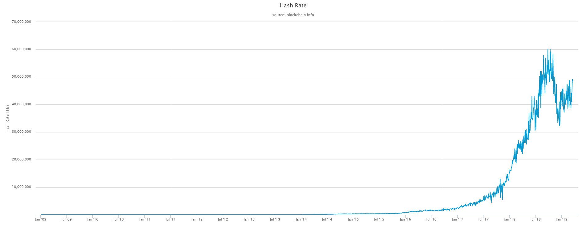 Since April 2017, within a two-year span, the hashrate of the bitcoin network has increased from 4 exahash to 48.5 exahash, by more than 12 fold.