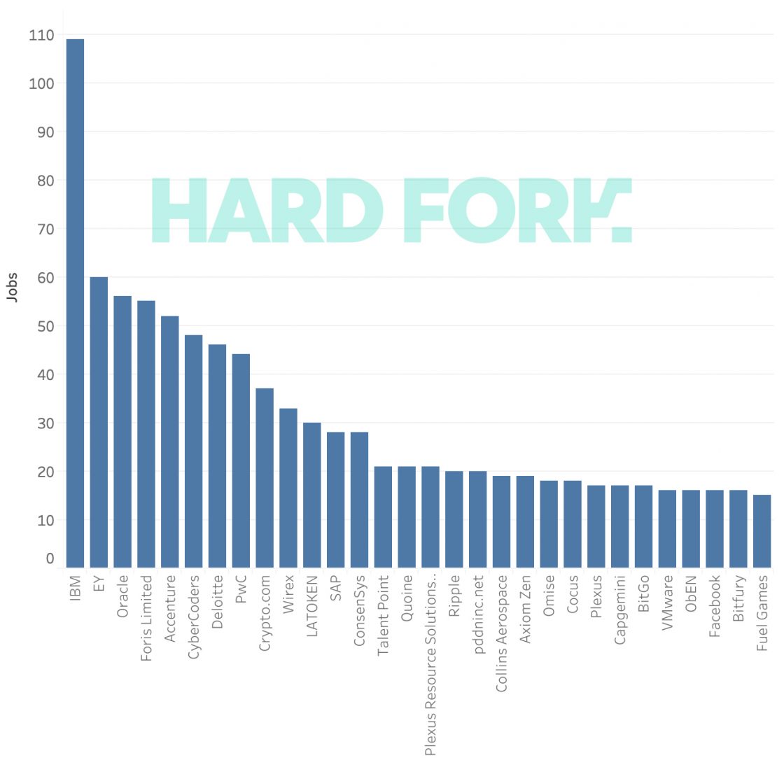 Data from GlassDoor, a platform that rates companies and management, indicated that boasts the most blockchain-related jobs at 110, with accounting powerhouse and coming in second and third respectively. Other big names include , , and . All this even before mentioning the many blockchain-specific startups all over the world.