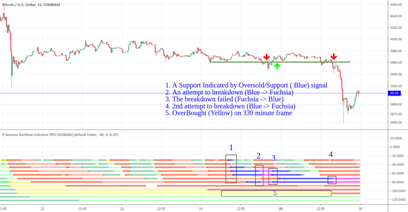 A useful signal given by “9 Seasons Rainbow Multiple Time Frames Pattern” is Oversold / Support (Blue) -> Crazy Sold (Fuchsia), which indicates an attempt of break down is going. If it reverses, Fuchsia turns back to Blue, it indicates a failed breakdown.