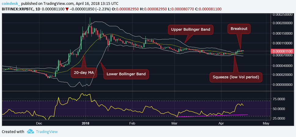 The above (prices as per Bitfinex) shows a (+2 and -2 standard deviations from the 20-day MA) squeeze, followed by an upside breakout on April 12.