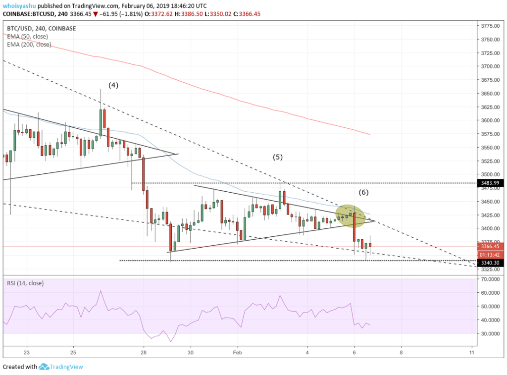 The (BTC/USD) bottomed at $3,340 on an intraday basis, while retesting the low of January 29 trading session. There was a little attempt from bulls to reverse the price action with the bearish bias intact. Nevertheless, the pair consolidated above $3,340, which served as an opportunity to reclaim $3,400 in the near-term.
